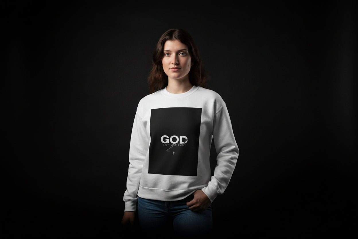 A soft, midweight crewneck that reads like a quiet statement. The white sweatshirt features a stark black square print with the word “GOD” rendered in clean serif type and subtle script strokes beneath — minimalist and contemplative. Wear it on cool mornings, at low-key gatherings, or while journaling at your favorite cafe. The classic crew silhouette and ribbed collar hold shape through repeated wear, while the 50/50 cotton-poly blend gives a cozy drape without feeling heavy. Subtle details — tubular knit construction for a smooth side-seam-free look, reinforced double-needle stitching, and tear-away label — keep the focus on the graphic and the feeling it creates: calm, thoughtful presence.